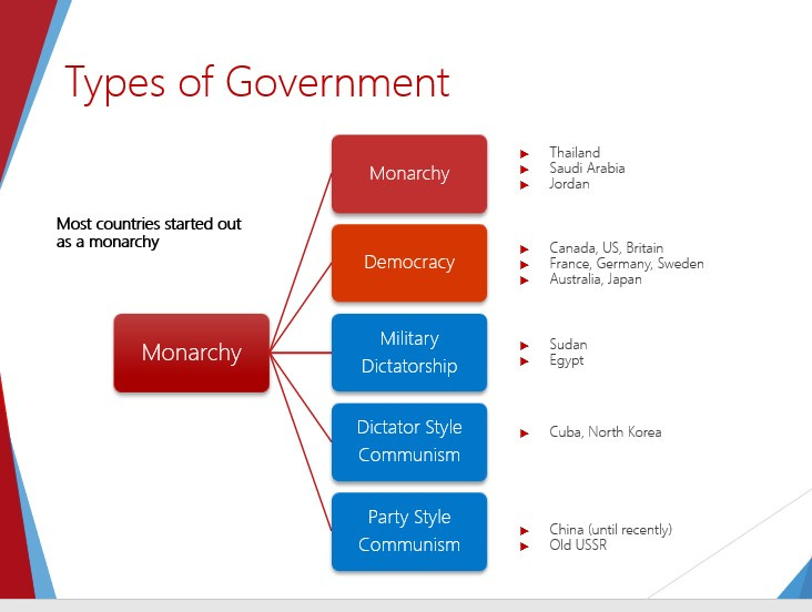 Dictatorships are either military based (generally through a coup) or founded on a leader who gains support of the military. These were popular in Central and South American plus Mexico. Dictators would then either leave the economy alone or convert it to communism.