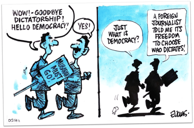 Second, adopting countries must learn from the pros. Older democracies have already figured out you need to separate church from state. This means you can’t have a religious party that wants to implement a faith-based constitution. It’s too restrictive for when you educate your people. Third, you need established parties who fight like cats and dogs. Democracy is an exercise in exhaustion. Ideas have to be totally thought out and battled over, and a significant chunk of the population must participate. (That’s why we have lousy dinner parties.)
